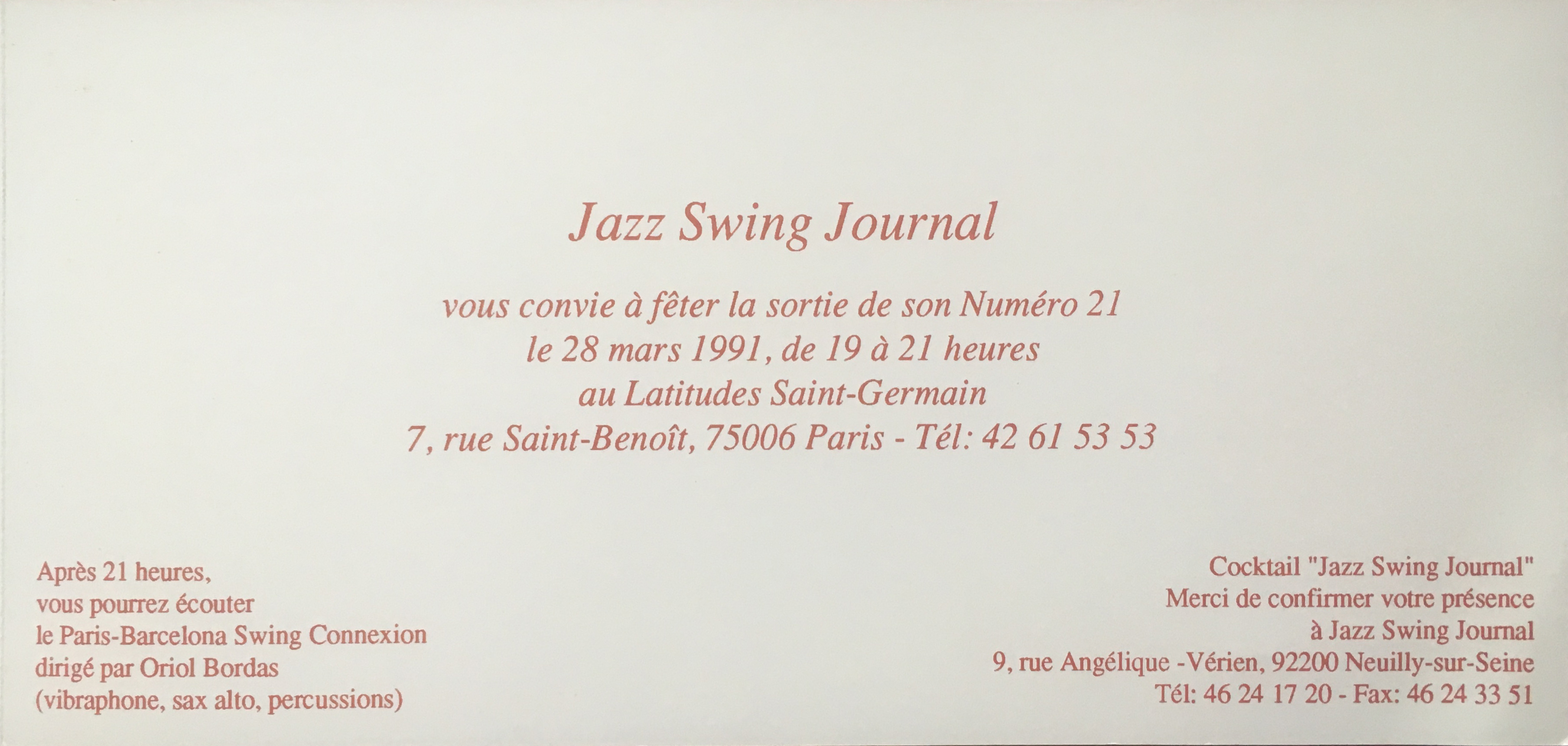| cmj-thdoc-pap-4-15 | Jazz Swing Journal. Invitation à fêter la sortie du numéro 21. Concert cocktail le 28 mars 1991. | Cartoline, dépliant 21cm x 10cm. Photo d'une toile par 'Thibault'. | France, 1991. | 204 |