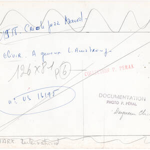 Orchestre de Jacques Hélian, salle de concert, 1951. Josette Day. En bas '32', 'Josette Day', 'Star'. Orchestre 'VALDO', restaurant ou cabaret. Duke Ellington, Paris gare du Nord, juillet 1948 Patrice et Mario. En bas 'Gaby Montreal'. Orchestre 'AC', salle de concert. En bas 'Studio Harcourt'. Felix Paquet et Mistinguett, cabaret ou dancing. Ray Ventura, salle de concert ou studio d'enregistrement, août 1967. Orchestre, cabaret. Maxime Saury avec sa clarinette. En bas 'Maxime Saury Grand Prix du Disque'. Louis Armstrong avec sa trompette, 1955. Orchestre de Géo Daly au Radio Club (EVE) à Paris, 1945 ou 1946. Orchestre non identifié, salle de concert. Danièle Darrieux. En bas, '96' 'Danièle Darrieux', 'UFA'. Joueur de trombone. Signature 'Wagram Bruxelles à l'encre. Orchestre en studio, CBS, 1936. Trio de saxophone devant un orchestre, dont Alix Combelle, salle de spectacle. Johnny Hess (au piano) et Charles Trenet, vers 1935. En bas, Teddy PIAZ, 122 Champs-Elysées Paris'. Johnny Hezz et Charles Trenet, vers 1935. En bas, 'Teddy PIAZ'. Artistes sur scène: Edith Piaf, Dalban, Lona Rita, Colin et Serge Davry. Allemagne, 1943 ou 1944. The Red Devils, 1924 (1/4). The Red Devils, 1924 (2/4). The Red Devils, 1924 (3/4). The Red Devils, 1924 (4/4). Groupe en extérieur (quai de gare ?).