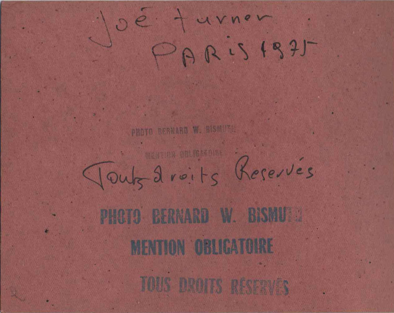 bwb-docp-phot-1-12 | Bernard W. Bismuth | Joe Turner, club parisien, 1975. | Photo couleur collée sur isorel, 17,5cm X 126,5cm.Tampon au dos 'Photo Bernard W. Bismuth'.Annotation à l'encre 'Joe Turner, Paris, 1975'. | France, 1975. | 316 | ||