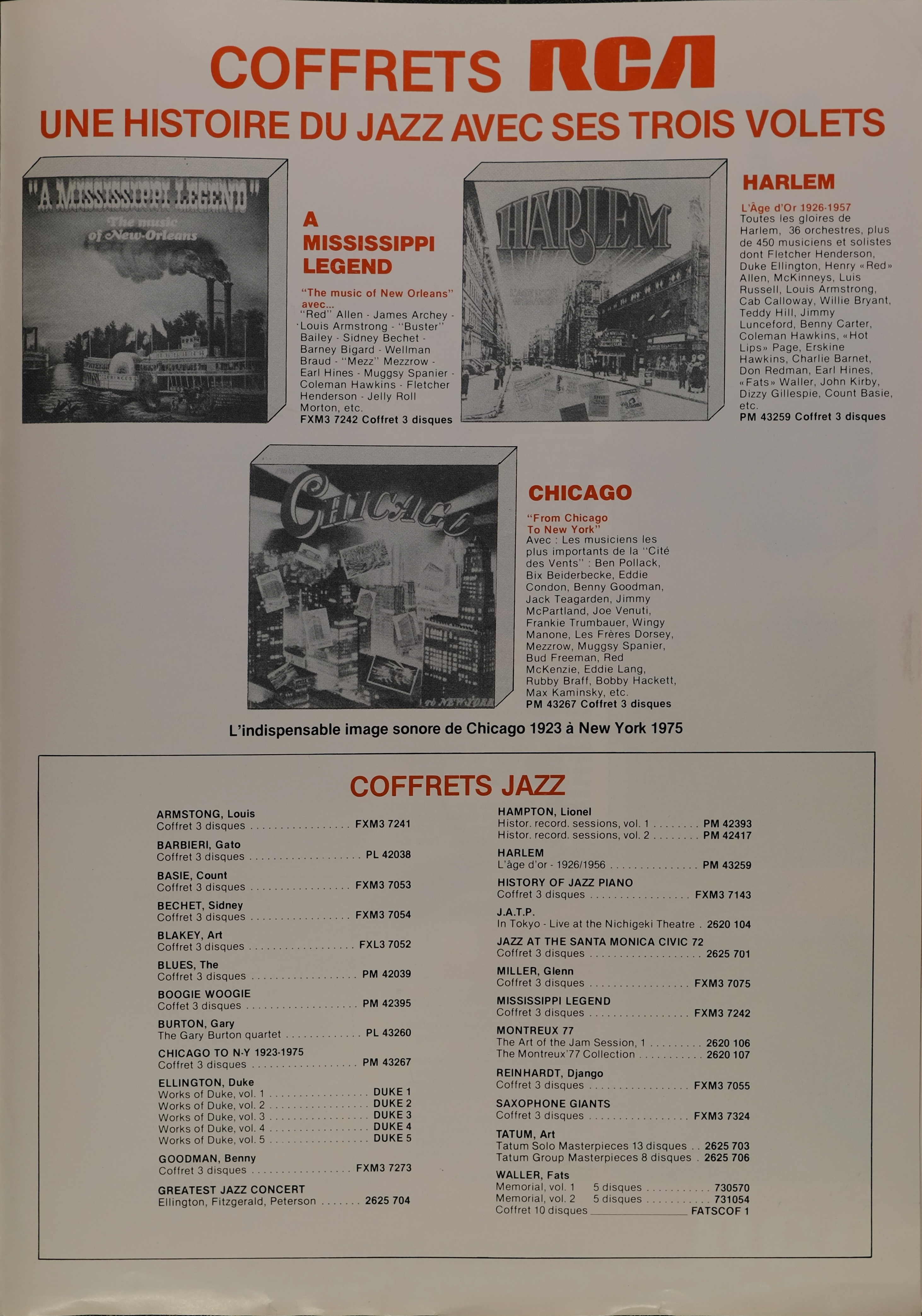 | irk-pub-mus-2-15 | RCA Jazz. Centanaire 1877-1977. | Catalogue disques Jazz RCA. | Livret 25cm X 10,5cm, 44 pages, couverture cartonnée. Photos noir et blanc et couleur des pochettes. Annotation, quelques découpes. | France, 1977. | 84 | ||