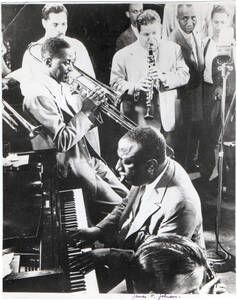 mpf-docp-phot-3-14Auteur inconnu.James 'P' Johnson et musiciens.Photographie, tirage argentique, papier brillant, format 20 cm X 25,5 cm. Mention au bas manuscrite James 'P' Johnson. Au dos, au crayon : James P. Johnson, Pianiste et Compositeur - Ph. U.S.I.S', à l'encre '63778-LA'.Origine inconnue109