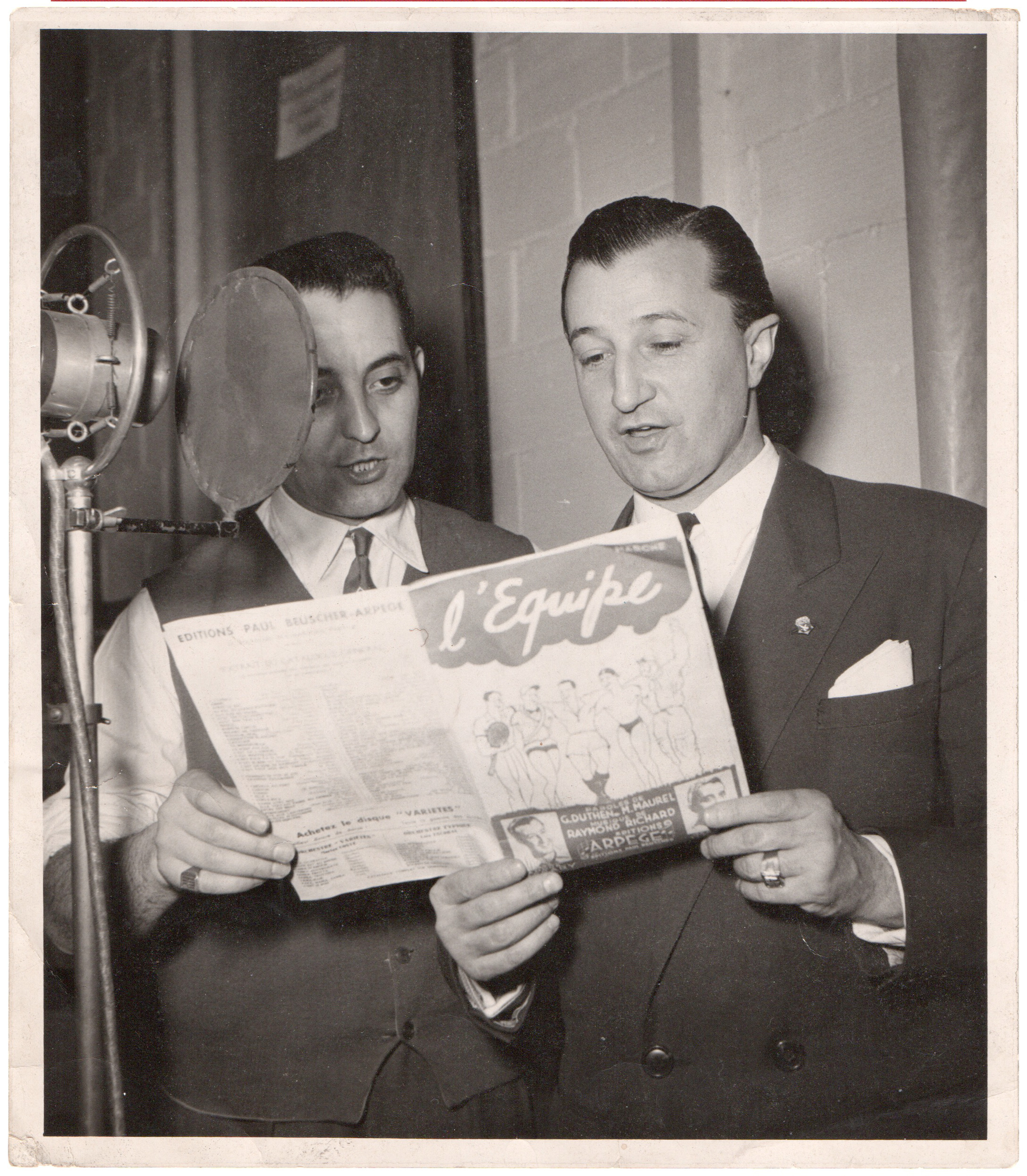 | obr-docp-phot-2-5 | Auteur inconnu. | André Dassary au micro (studio de radio), 1949. | Photographie, tirage argentique, papier brillant, format 18cm X 20,7cm. | Lieu non identifié. Au verso: au l'encre noire 'A. Dassary, 1949'. | 32 | ||