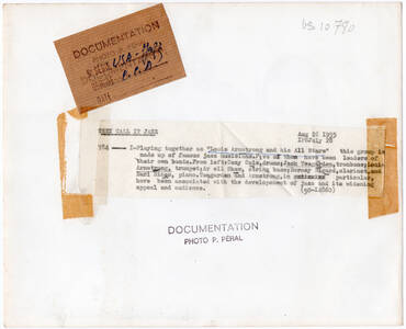obr-docp-phot-3-15Auteur inconnu.Louis Armstrong and his all Stars. De gauche à droite, Cozy Cole (drums), Jack Teagarden (trombone), Louis Armstrong (trumpet), Arvell Shaw (string bass), Barney Bigard (clarinet) et Earl Hines (piano). 26 Août 1955. Photographie, tirage argentique, papier brillant, format 20.7cm X 25.5cm. Au verso: tampon, 'Documentation Photo P. Péral'.Etiquette collée au verso, 'Documentation Photo P. Péral, Série USA-Jazz, Origine C C A (?)'. Légende collée au verso, 'They call it Jazz Aug 26 1955 IPS July 29. 784 -- I- Playing together as 'Louis Armstrong and his all Stars' this group is made up of famous jazz musiciens. Five of them have been leaders of their own bands. From left: Cozy Cole drums, Jack Teagarden trombone, Louis Armstrong trumpet, Arvell Shaw string bass, Barney Bigard clarinet and Earl Hines piano. Teagarden and Armstrong in particular have been associated with the development of Jazz and its widening appeal and audience. (50-14860)'. Mention au crayon 'US 10 780'.32