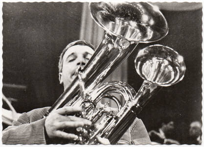 obr-docp-phot-3-24Auteur inconnu.Raymond Fonsèque au 'trombonium', lors de la 'Nuit du Jazz', salle Wagram en 1965.Photographie, tirage argentique, cartoline brillant, format 10.5cm X 14.8cm. Au verso, imprimé, 'Le trombonium joué par Raymond Fonsèque' et 'La Cerisaie C.2 (95) Villiers le Bel.Au verso sur un post-it 'Nuit du Jazz 1965, Salle Wagram'.32