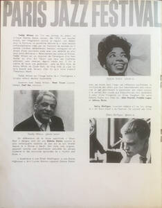 obr-prog-crt-2-15Paris Jazz Festival, 1965.Programme des concerts du Paris Jazz Festival 1965, les 3 et 4 novembre au Palais de la Mutualité, Paris.Livret 12 pages, 21cm X 27cm, couverture cartonnée. Biographies et photographies des musiciens. Teddy Wilson, Dakota Staton, Le Gerry Mulligan All Stars, Bill Evans et Lee Konitz, Lennie Tristano, Les Art Blakey's New Jazzmen, Sonny Rollins, Ornette Coleman.France, 1965.121