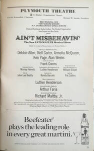 obr-prog-crt-4-10Ain't Misbehavin' 1979.Programme du 'New Fats Waller Musical Show', Ain't Misbehavin'. Plymouth Theatre, May 1979.Livret 14cm X 23 cm, 50 pages. Programme, photographies en noir et blanc, nombreuses publicités.UK, 1979. Voir plaquette obr-prog-crt-4-9.121