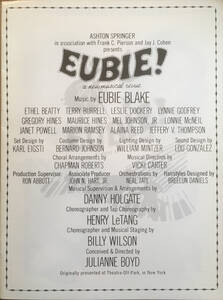 obr-prog-crt-4-13Eubie! A new Musical Review. 1979.Présentation de la 'New Musical Review', Eubie! Biographies, photographies en noir et blanc du spectacle, et des artistes.Plaquette 22,5cm X 30,5cm, 20 pages, couverture cartonnée.UK, 1979. Voir programme obr-prog-crt-4-14.121