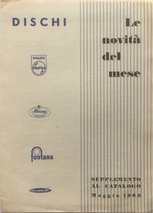 | obr-pub-mus-4-11 | Philips, Mercury, Fontana, Melodicon. | Melodicon, Milano. Le novità del Messe. Supplemento al catalogo Maggio 1962. | Petit catalogue 14cm X 19 cm. 10 pages. | Italie, 1962. | 108 | ||