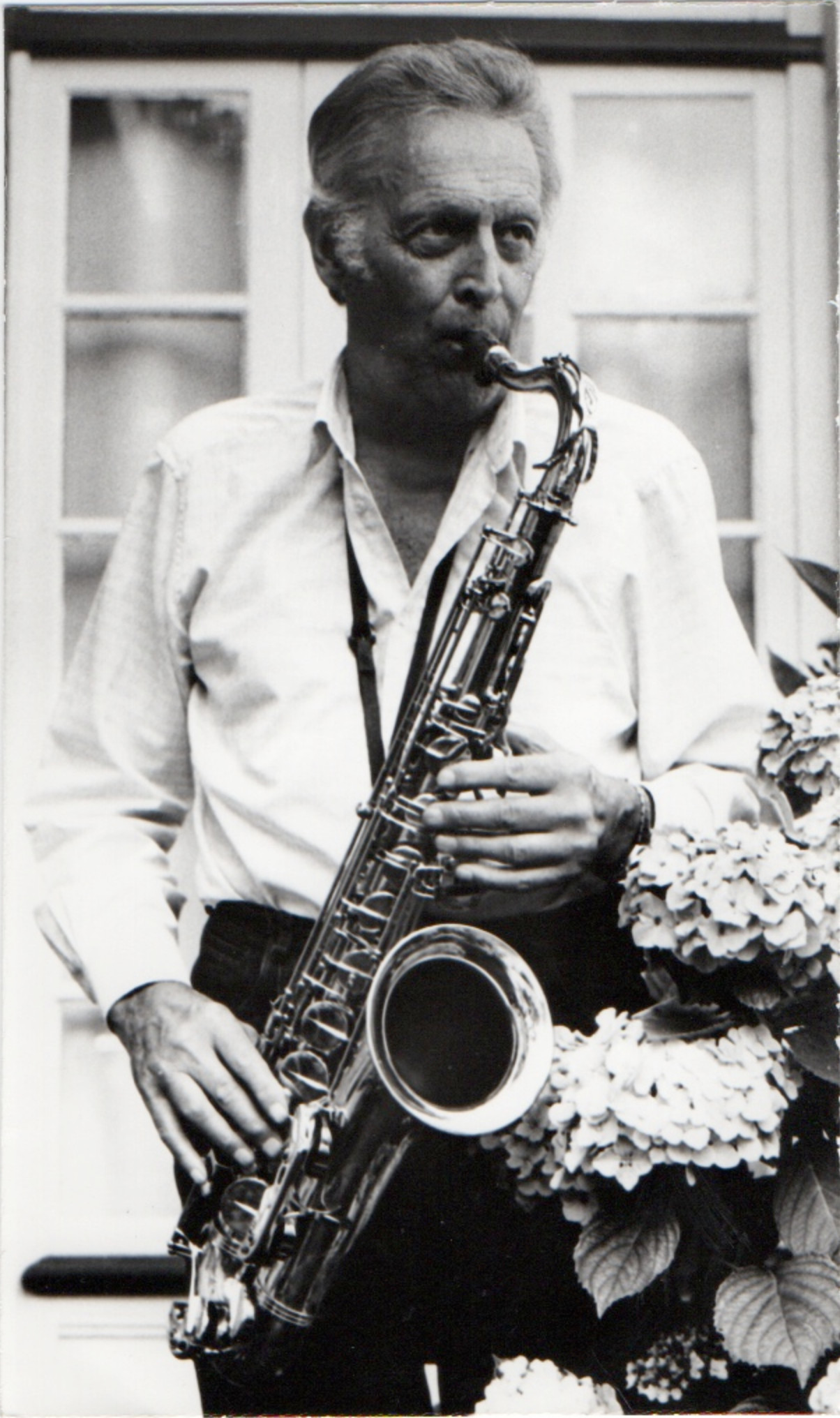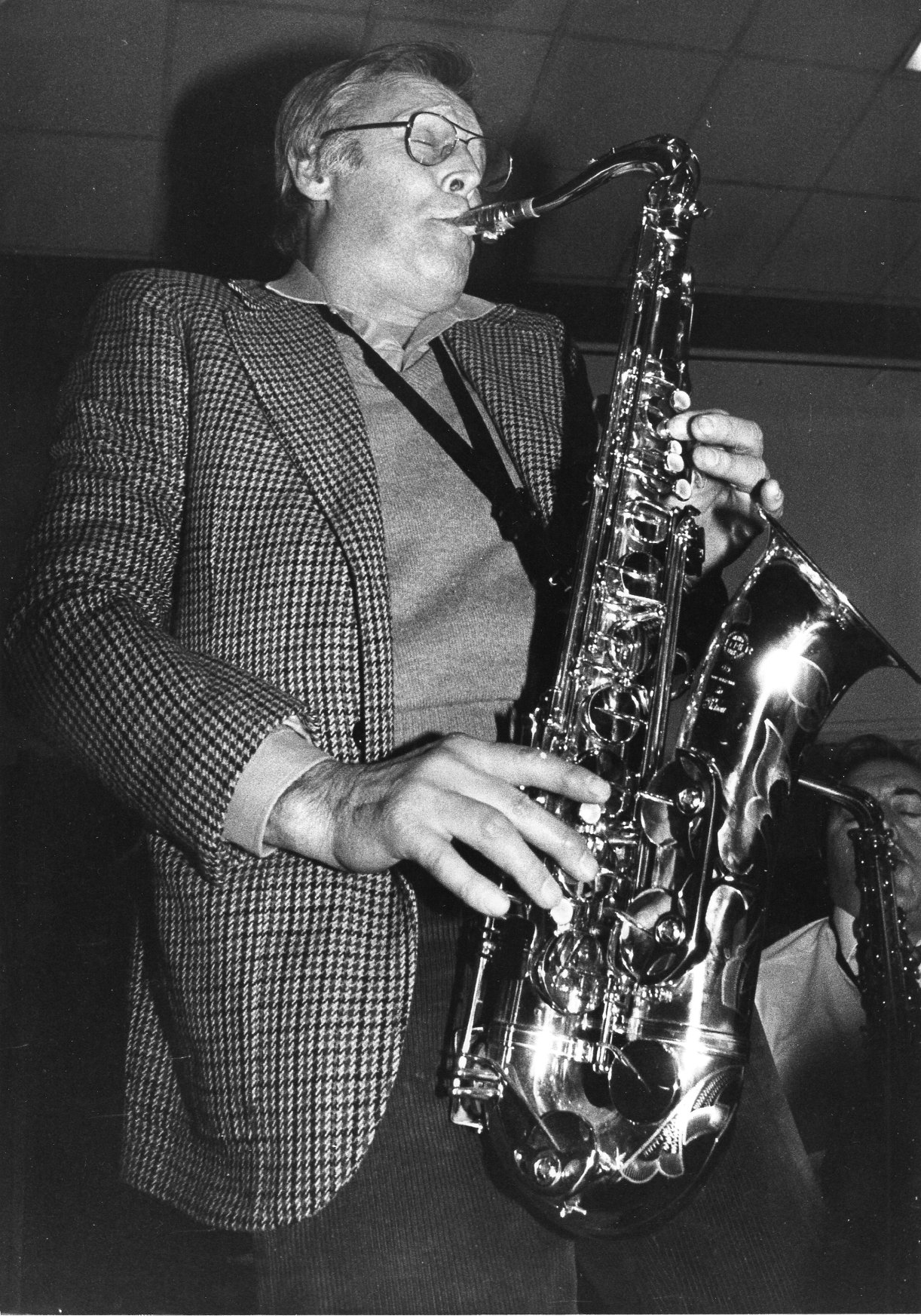 pve-docp-phot-3-3Photo Michel Lionnet.Paul Vernon au saxophone ténor.Tirage argentique, papier glacé, noir et blanc, 13 cm x 18 cm.Lieu et date inconnus.218