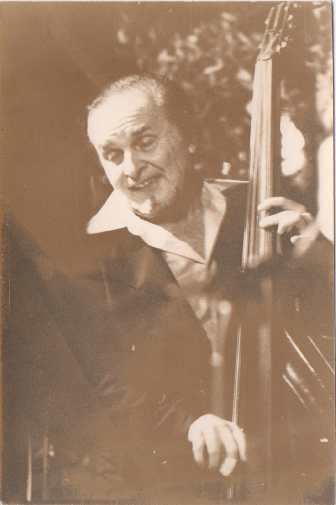 bwb-docp-phot-5-8 | Bernard W. Bismuth | Contrebassiste. | Tirage argentique, noir et blanc, cartoline semi-mat 'sépia', format 12cm X 18cm. | Lieu inconnu, date inconnue. | 316 | ||