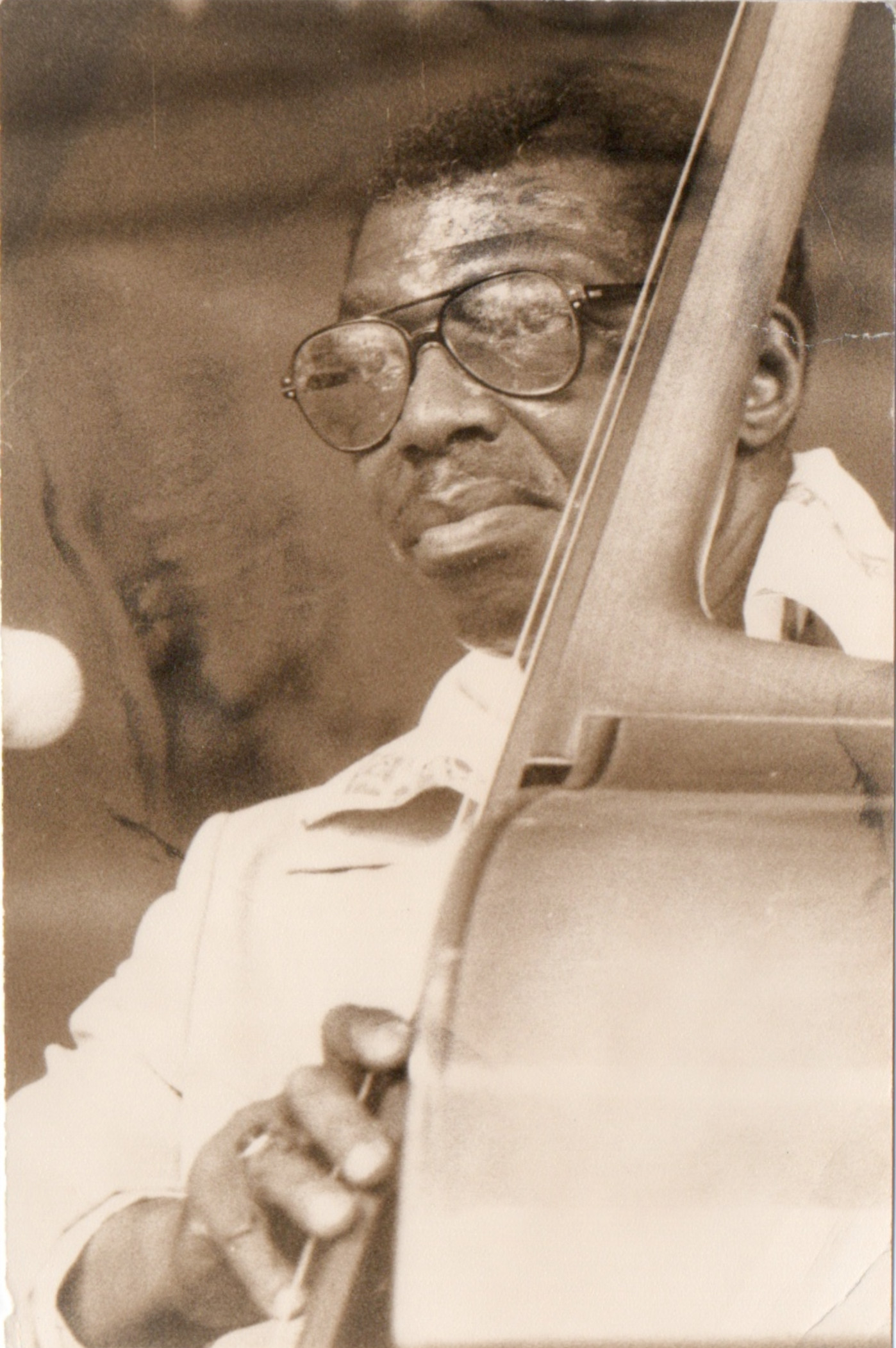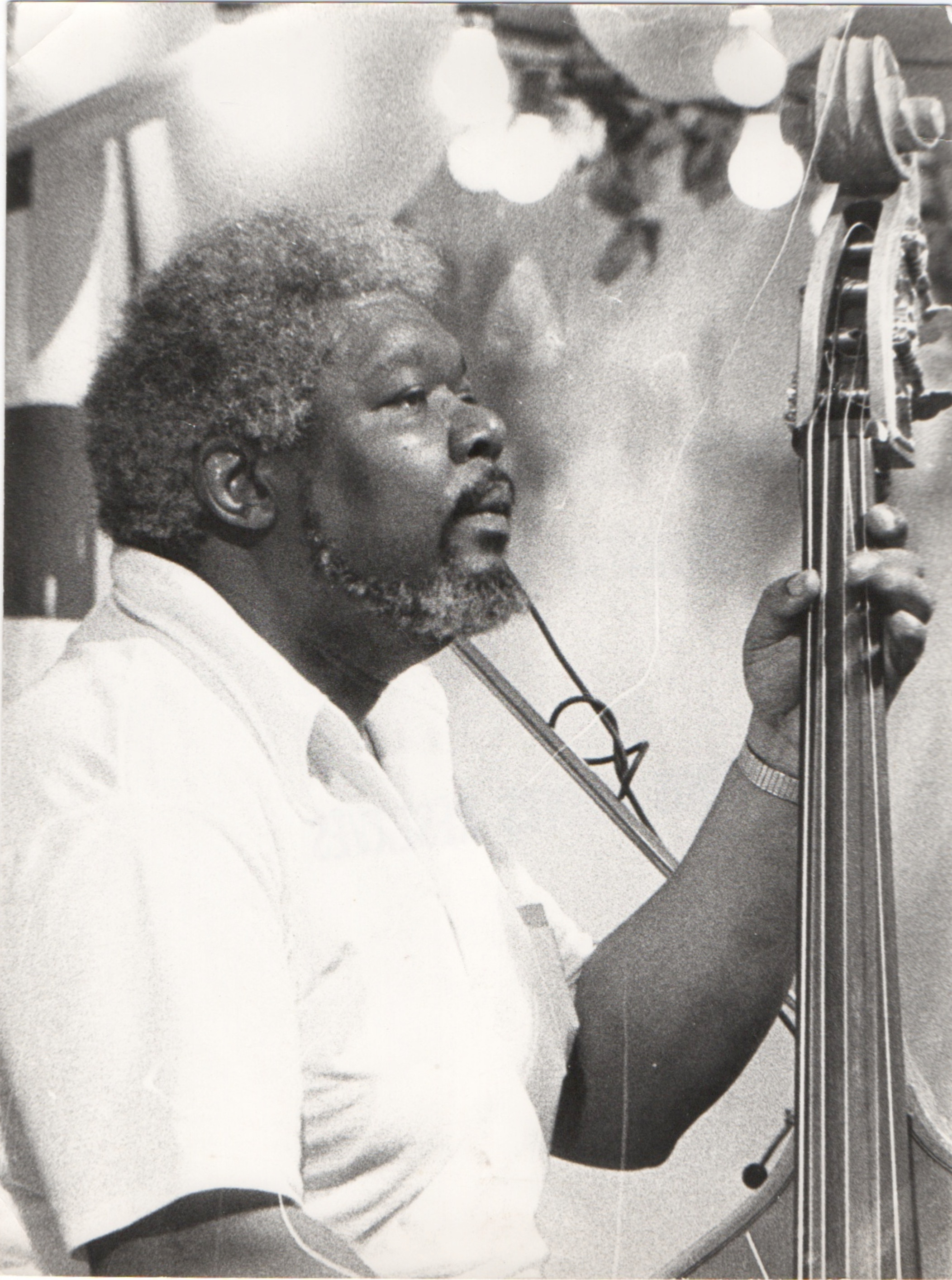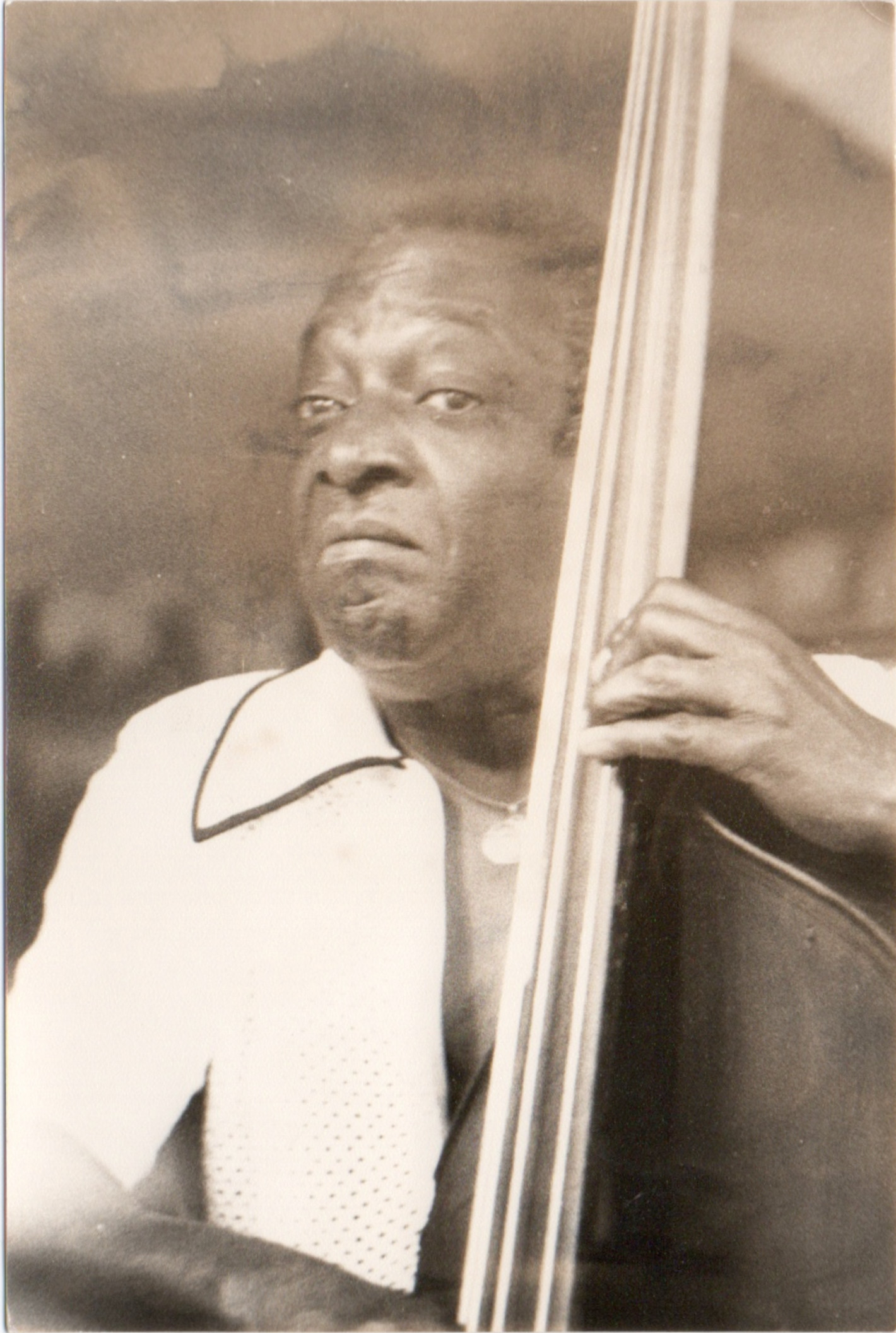 bwb-docp-phot-5-19 | Bernard W. Bismuth | Contrebassiste. Major Holley. | Tirage argentique, noir et blanc, cartoline semi-mat 'sépia', format 12cm X 18cm. | Lieu inconnu, années 70. | 316 | ||